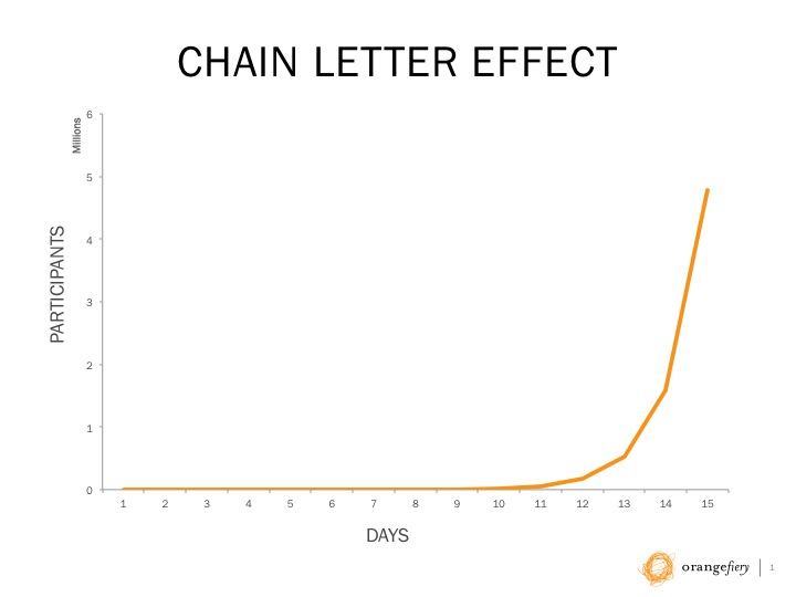 The Law of Numbers: Finally, and perhaps most importantly, there’s the math. As a challenge like this gains participation, the number of participants grows exponentially, just as a consequence of each challenge spreading to three more people. We modeled the rules of the ice bucket challenge in an Excel spreadsheet and charted the results below in what we call the “chain letter effect.”
