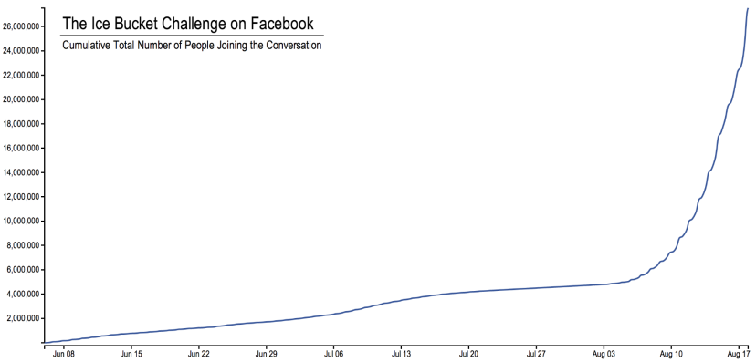 This chart, released by Facebook, supports the notion that the #icebucketchallenge is a viral, social media influence phenomenon. (Worth noting, the Facebook charts are based only on Facebook data).
